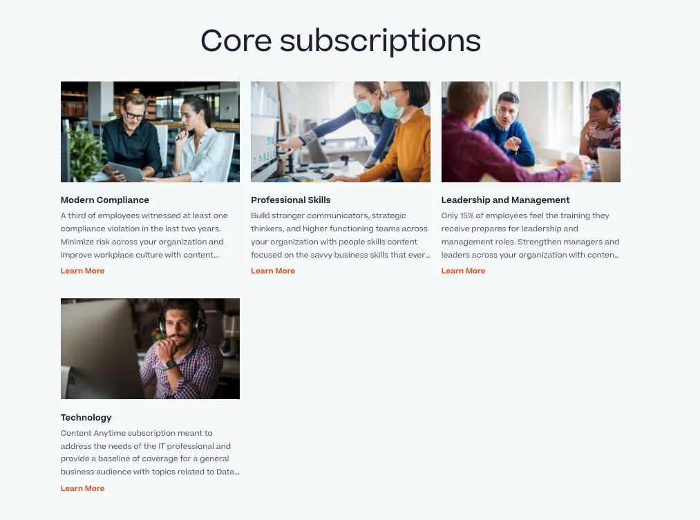 Imagine having access to a boundless library of captivating content from the world’s foremost providers, all in one convenient location. That’s exactly what you get with Cornerstone Content Anytime, a top-tier subscription service that offers carefully curated e-learning content. We’ve brought together exclusive original content from our in-house experts at Cornerstone Studios, along with a wealth of aggregated content from industry leaders. With Cornerstone Content Anytime, you’ll always have access to fresh, engaging and instructional material to enhance your online learning offerings.