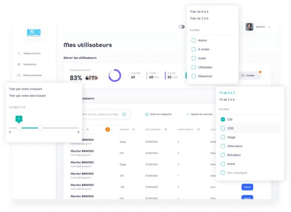 - Dashboard et filtres avancés sur votre base salariés (ancienneté, situation familiale, type de contrat,…)