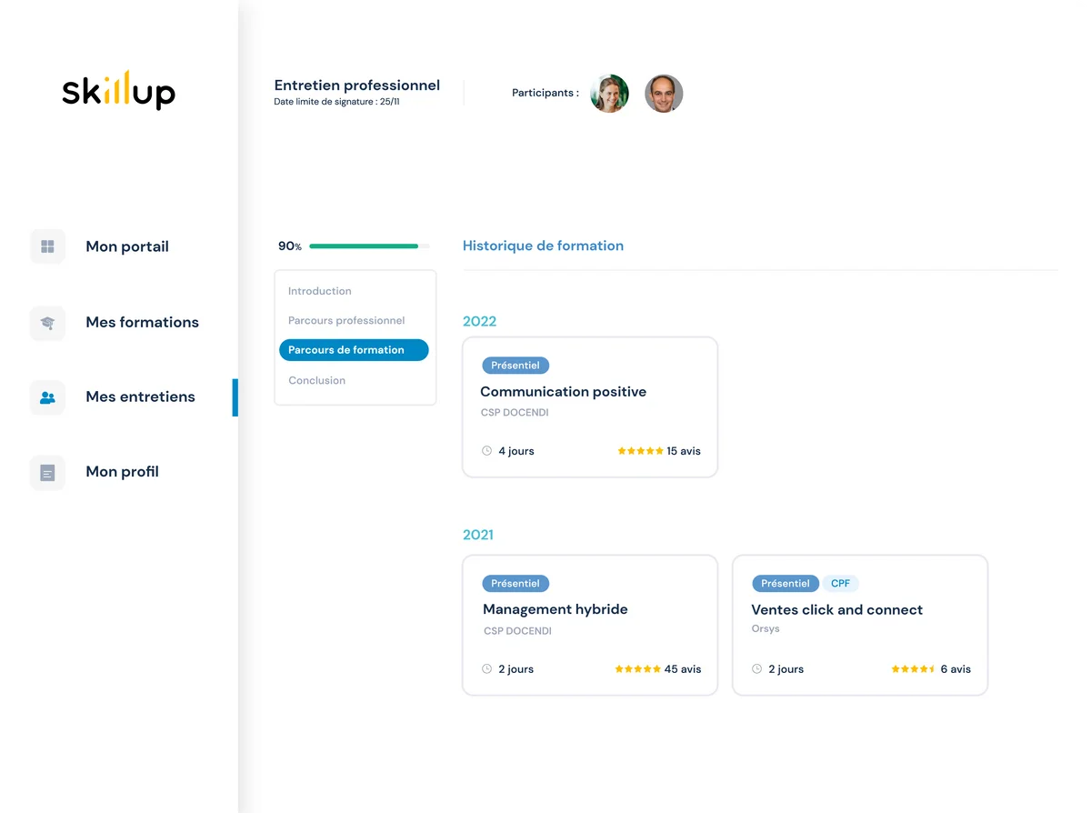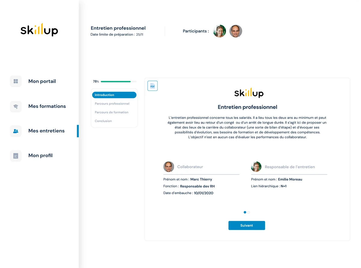 Skillup Entretiens recréer du lien entre vos équipes RH, vos collaborateurs et vos managers. Vous pouvez dorénavant gérer vos entretiens professionnels de manière simple et développer des échanges enrichissants au sein de votre entreprise.