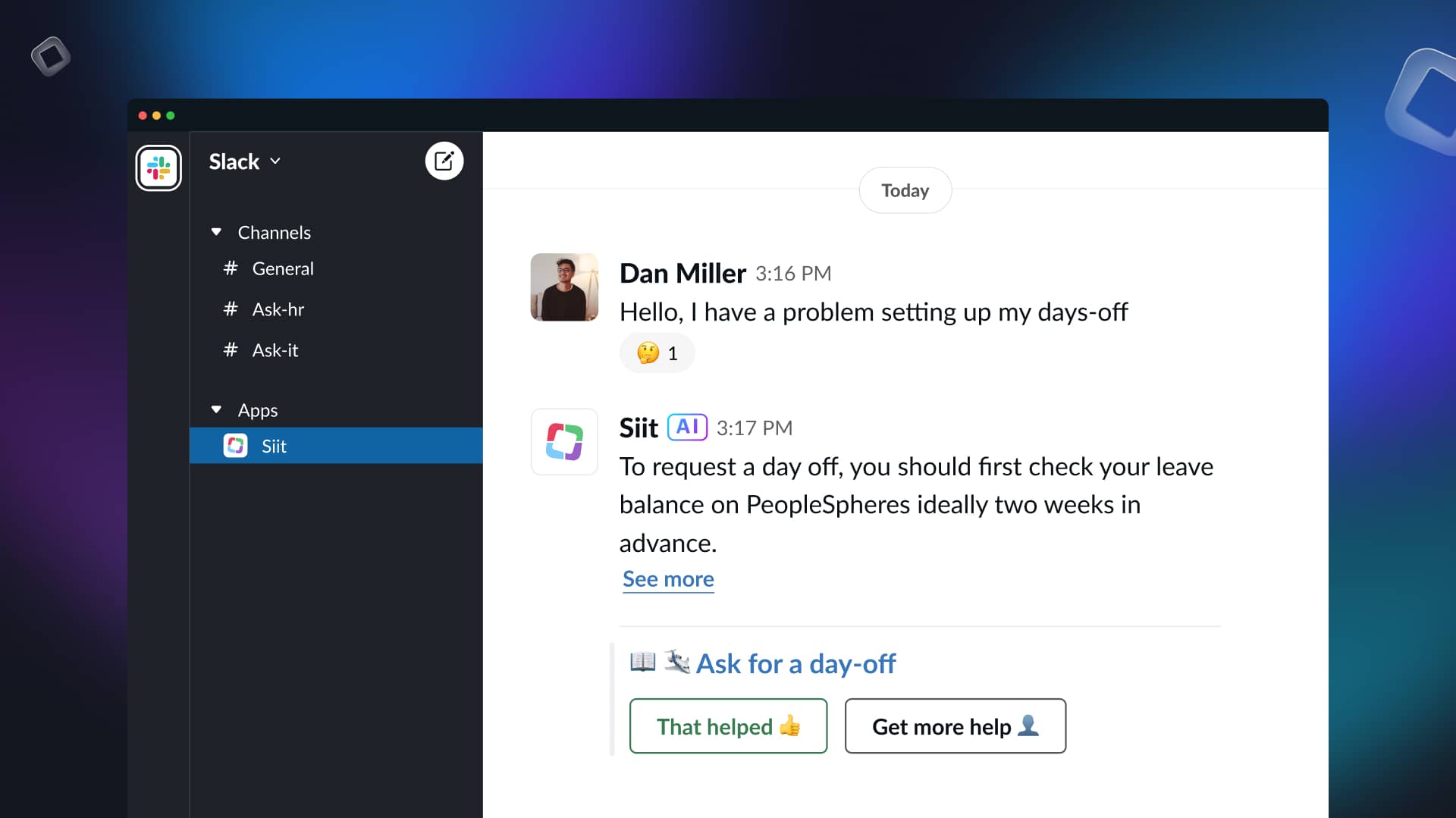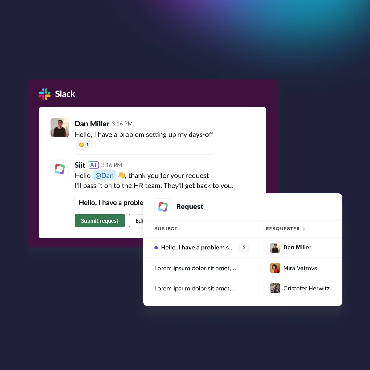 Siit réinvente le ticketing grâce à l’intelligence artificielle. Siit offre aux équipes RH et Opérations le pouvoir de gérer les demandes des employés de manière moderne, efficace et intégrée. En fournissant le premier service d’assistance interne dédié, il est désormais possible d’offrir une excellente expérience de service aux employés. L’outil Siit vous permet de rationaliser les demandes des employés et de gérer la communication avec les employés via vos canaux existants (Slack, e-mails, Microsoft Teams…). De plus, Siit vous permet d’automatiser le travail manuel et d’analyser vos actions. Siit vous aide également à prendre le contrôle de vos expériences employés.