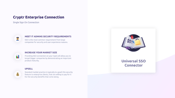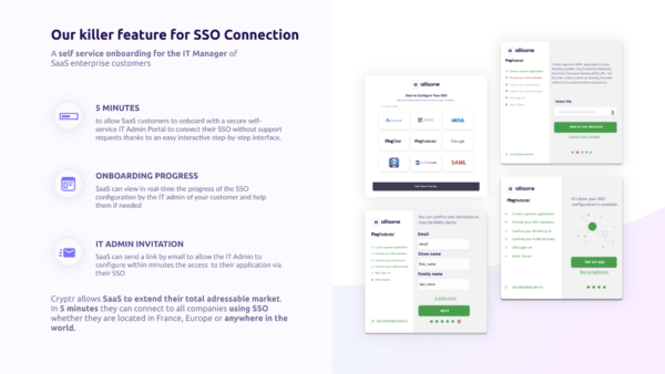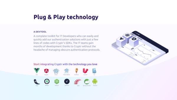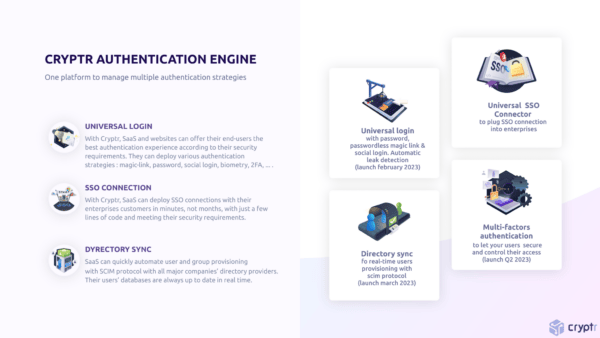 Cryptr propose des solutions d’authentification permettant aux SaaS et sites webs de proposer rapidement la méthode d’authentification la plus adaptée à leurs utilisateurs. En permettant aux clients d’externaliser tout ou partie de leur système d’authentification Cryptr leur permet de se concentrer sur des fonctionnalités à plus forte valeur ajoutée.