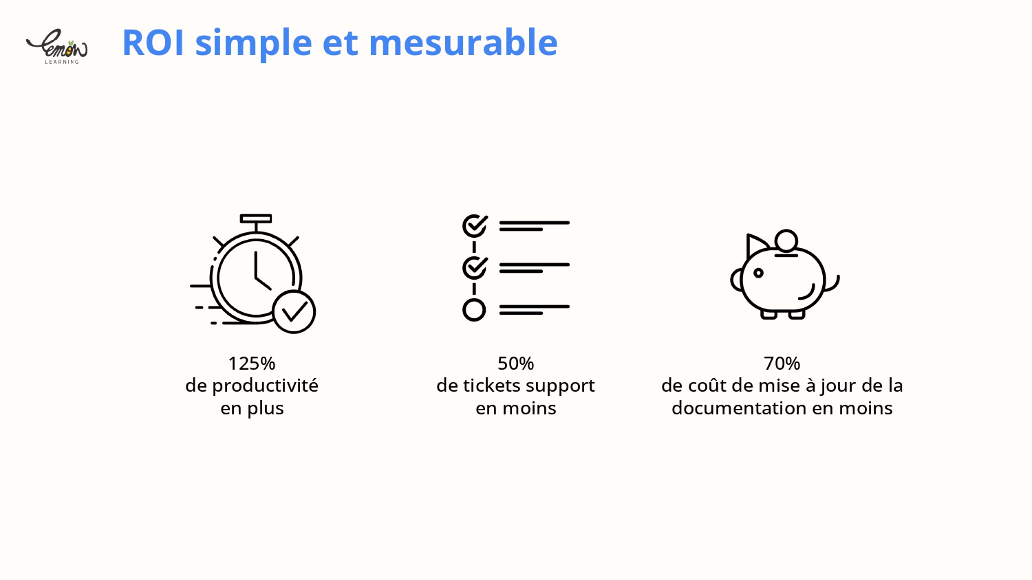 3 – Réduisez les demandes support sur PeopleSpheres grâce à un accompagnement disponible 24/7. La magie de Lemon Learning ? Sa simplicité. Les collaborateurs ont une prise en main quasi immédiate de PeopleSpheres. Résultat : vos équipes support consacrent moins de temps aux demandes support de niveau 1 et 2.