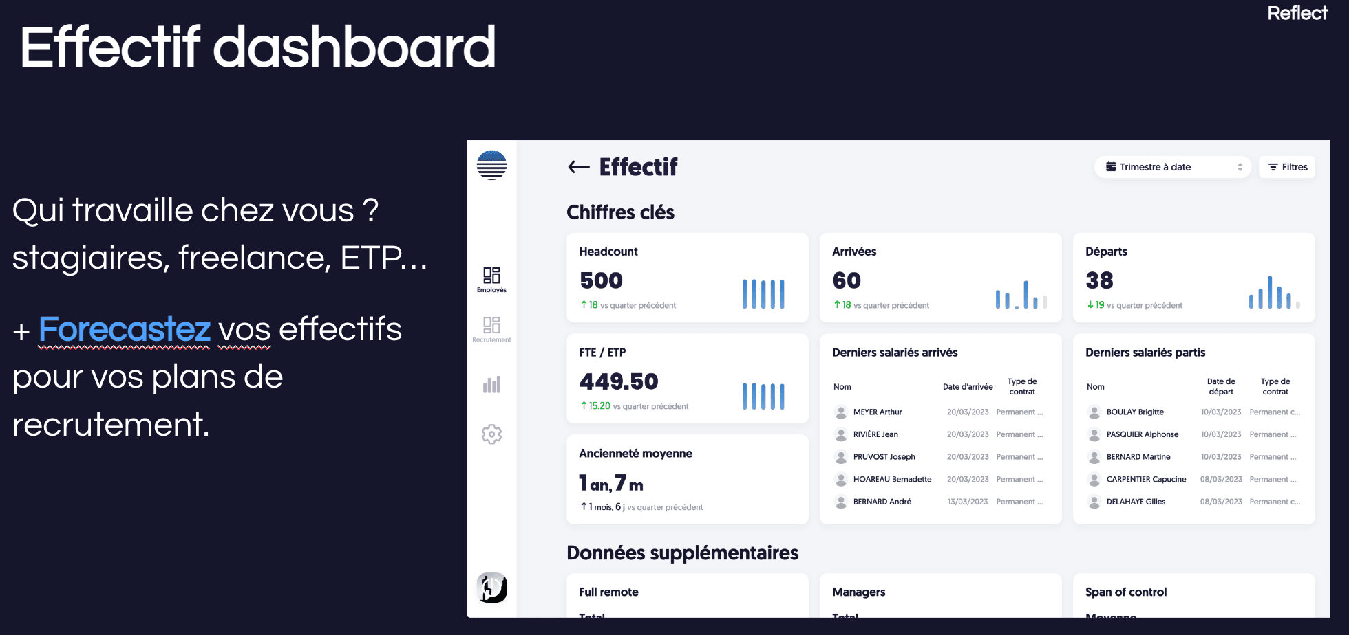 Reflect est la solution d’analytics RH, en temps réel. Vos équipes sont submergées par la création, gestion et fiabilisation de vos indicateurs RH (recrutement, évolutions de carrière, calcul de turnover…) ? Vous faites face à des obligations réglementaires (BDESE, Index Egapro…) qui vous prennent du temps. L’accès et la visualisation de vos données RH en temps réel est primordiale.