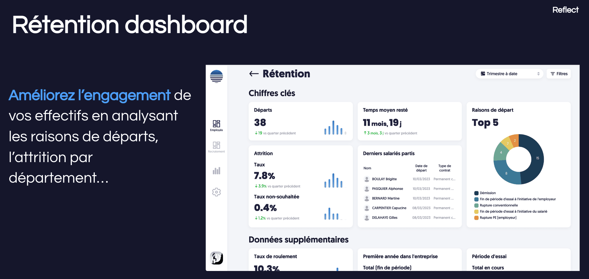 Grâce à cet outil, vous pourrez piloter efficacement vos indicateurs clés en matière de recrutement, d’évolutions de carrière, de calcul de turnover et de satisfaction client. En tant que décideur, vous avez besoin d’indicateurs pertinents pour prendre des décisions stratégiques basées sur des données concrètes. C’est pourquoi Reflect vous fournit des tableaux de bord personnalisés pour suivre la performance de vos processus RH en temps réel. Ces tableaux de bord vous permettent d’identifier les tendances, les écarts et les indicateurs de performance clés KPI pour mieux piloter vos activités. Grâce à Reflect, vous pourrez choisir les indicateurs les plus pertinents pour mesurer l’efficacité de vos actions et atteindre les objectifs fixés.