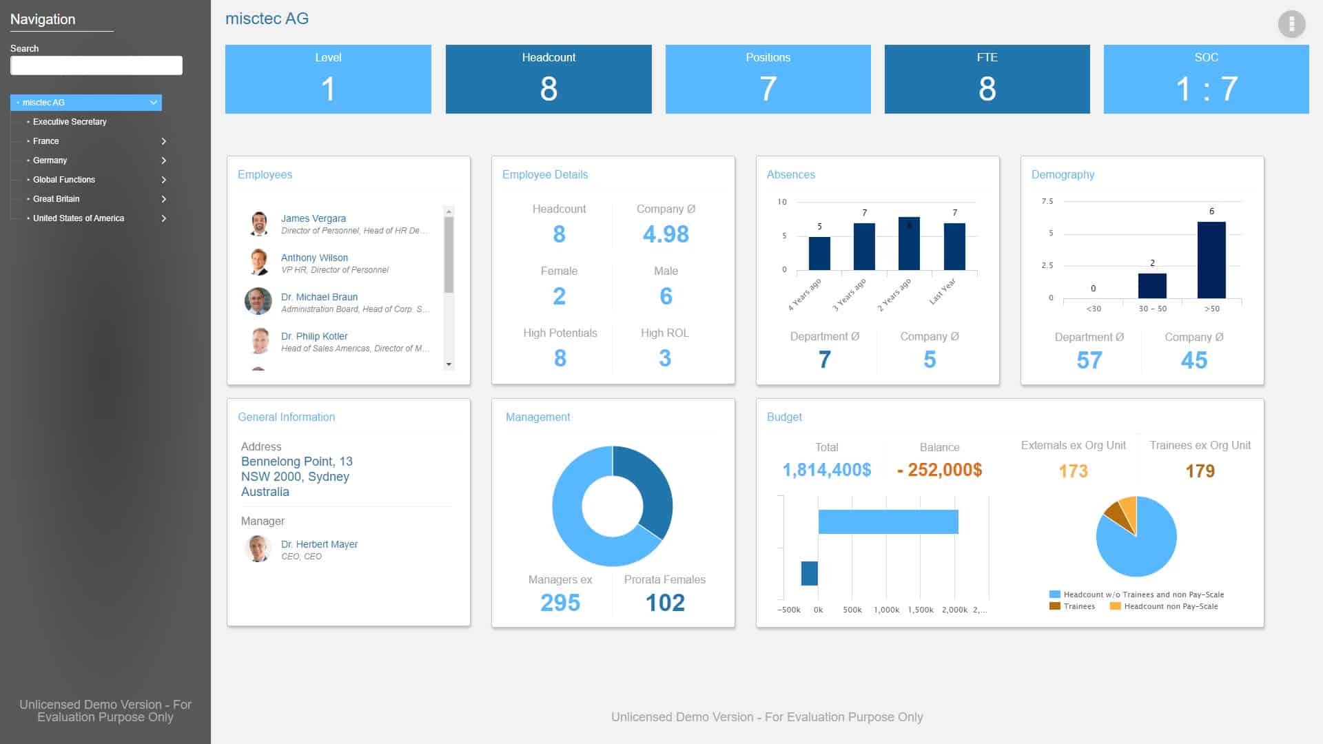 La solution logicielle fournit des informations importantes nécessaires pour vous permettre de prendre des décisions commerciales fondées. Il n’affiche pas seulement la situation actuelle, il offre également la possibilité de modéliser les changements structurels et de voir et d’évaluer leurs résultats potentiels. De cette façon, vous n’avez plus besoin de prendre des décisions basées sur l’intuition, mais vous pouvez vous fier aux faits et aux chiffres. Une meilleure collaboration grâce à une plus grande transparence pour que chacun trouve l’information qu’il recherche. Qu’il s’agisse de responsabilités, de lignes hiérarchiques ou de coordonnées, la fonction de recherche complète répond à toutes ces questions en quelques secondes.
