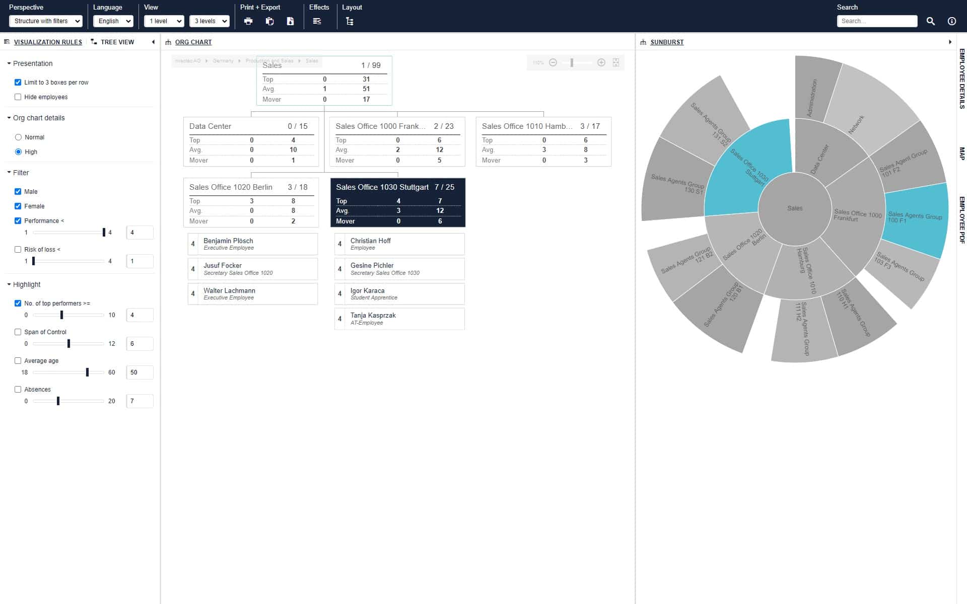 Les données stockées dans PeopleSpheres peuvent être automatiquement affichées sous différentes formes avec Ingentis org.manager. Les visualisations de données obsolètes sont donc un problème du passé. Cela permet non seulement aux clients d’économiser beaucoup de temps et d’efforts manuels, mais aussi de prendre des décisions commerciales basées sur des faits et des chiffres plutôt que sur un sentiment instinctif.