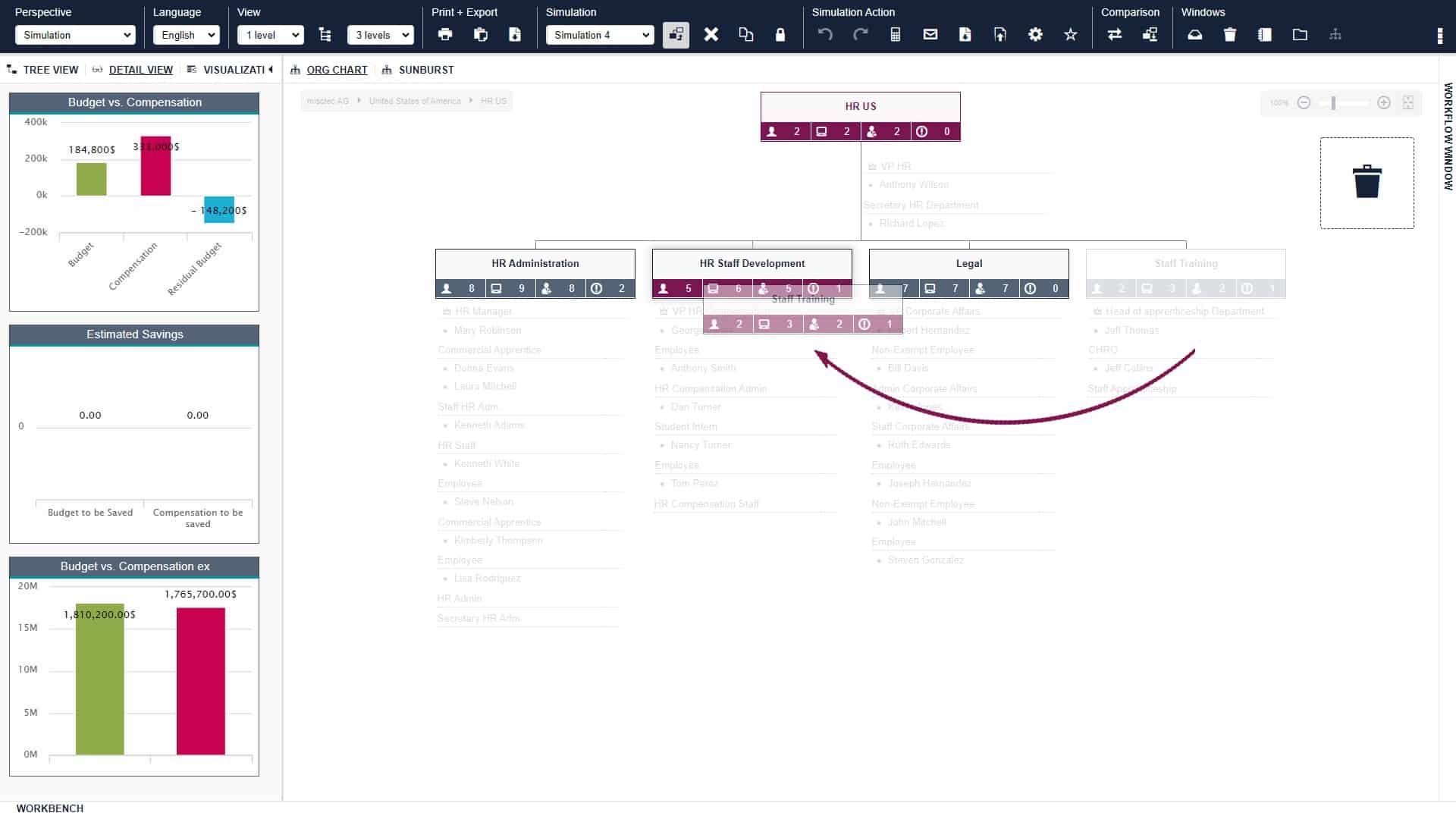 Les mauvaises décisions commerciales et les processus organisationnels inefficaces ne coûtent pas seulement du temps mais aussi et surtout de l’argent. Ingentis org.manager peut aider à les éviter de plusieurs façons. Tout d’abord, le logiciel vous permet d’identifier facilement les domaines qui nécessitent votre attention. Deuxièmement, une fois que vous avez détecté ces domaines, vous pouvez modéliser les changements et voir leurs effets sur la structure et les indicateurs clés associés avant de les mettre en pratique. La modélisation peut se faire simplement par glisser-déposer en fonction de la situation actuelle. De cette façon, vos décisions ne sont pas seulement bien des étendues de contrôle critiques ou des unités organisationnelles qui dépassent leurs budgets alloués pour effectuer les ajustements nécessaires et optimiser les performances de votre entreprise.