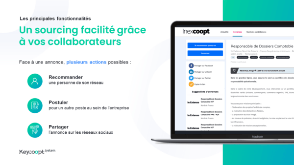 Keycoopt System a pour vocation de transformer vos collaborateurs en ambassadeurs de marque. Ils sont généralement perçus comme plus dignes de confiance que les représentants désignés d’une entreprise. Leurs discours sont alors mieux perçus et valorisés. La cooptation devient un atout majeur pour faciliter le sourcing, en exploitant le réseau de vos employés pour recruter des profils de qualité. De plus, environ la moitié des candidats recrutés grâce à cette méthode restent en poste pendant plus de trois ans. Grâce à cette solution digitale, les collaborateurs peuvent recommander des candidatures de leur réseau ou partager des annonces sur leurs réseaux sociaux, renforçant ainsi la marque employeur et facilitant le recrutement des meilleurs talents.